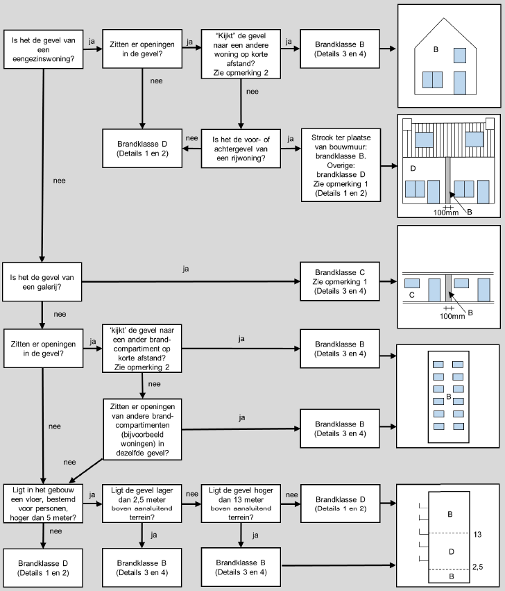 In veel gevallen moet bij nieuwbouw een gevel dus aan brandklasse B voldoen. Maar hier zijn wel uitzonderingen op. Zie hier onder schema zoals aangegeven op brandveilig.com