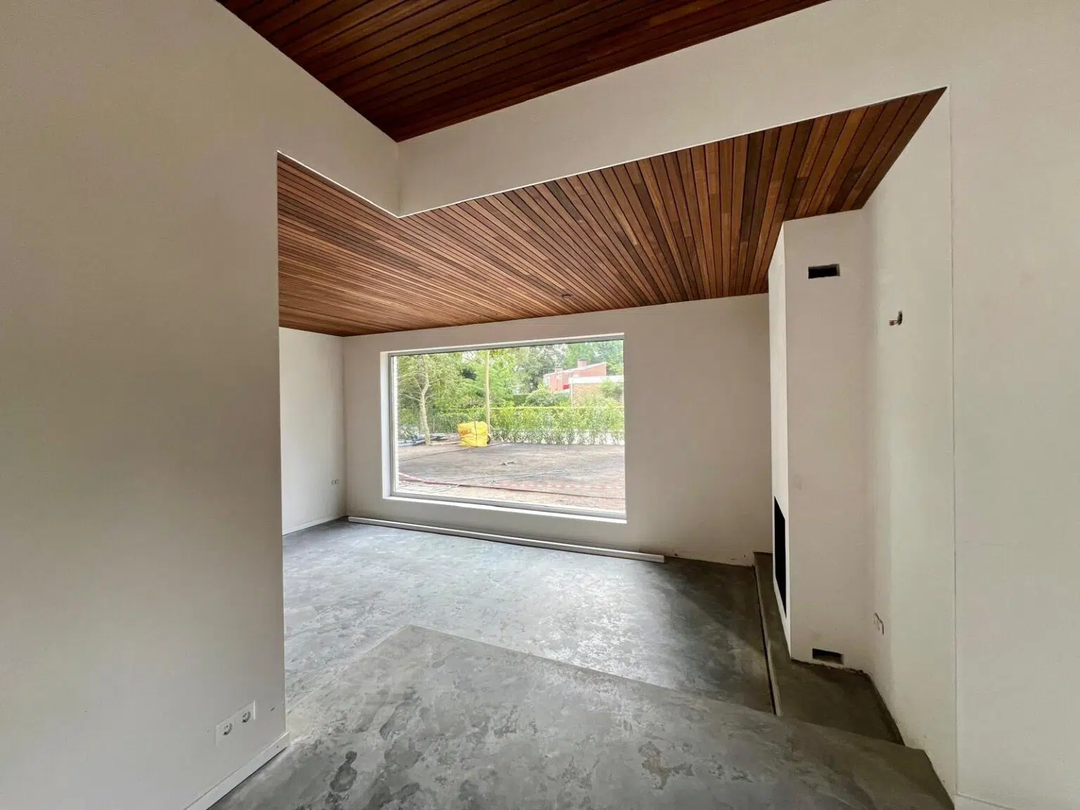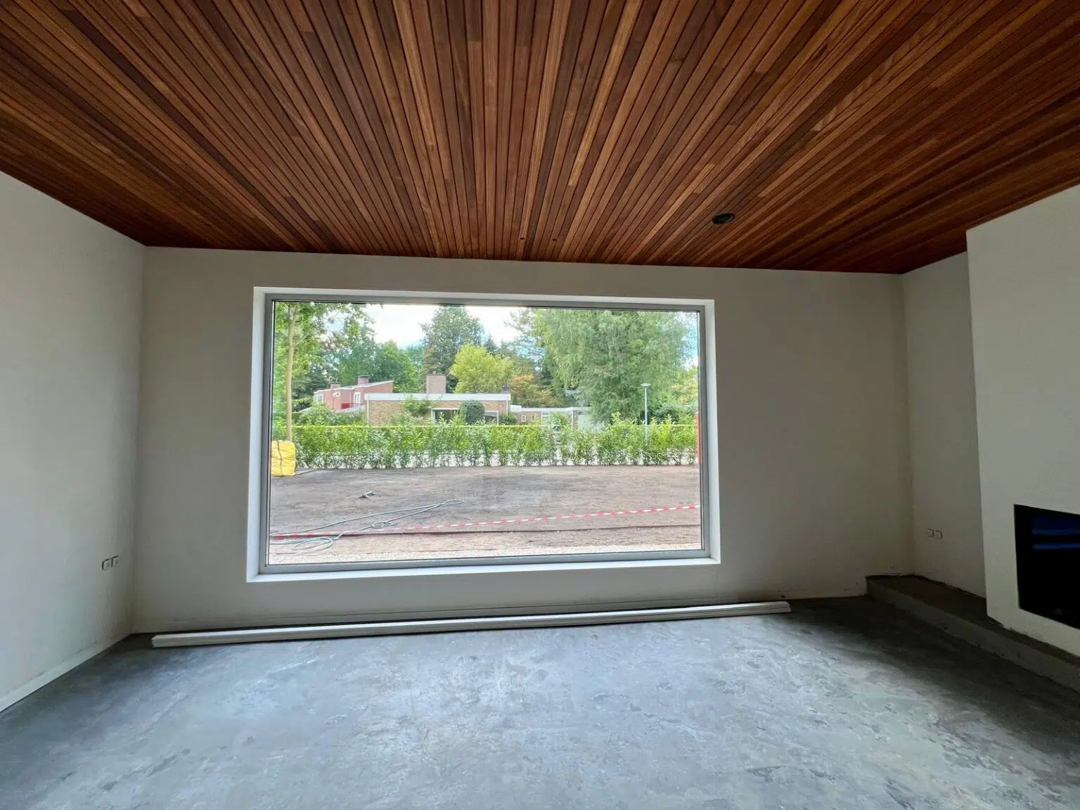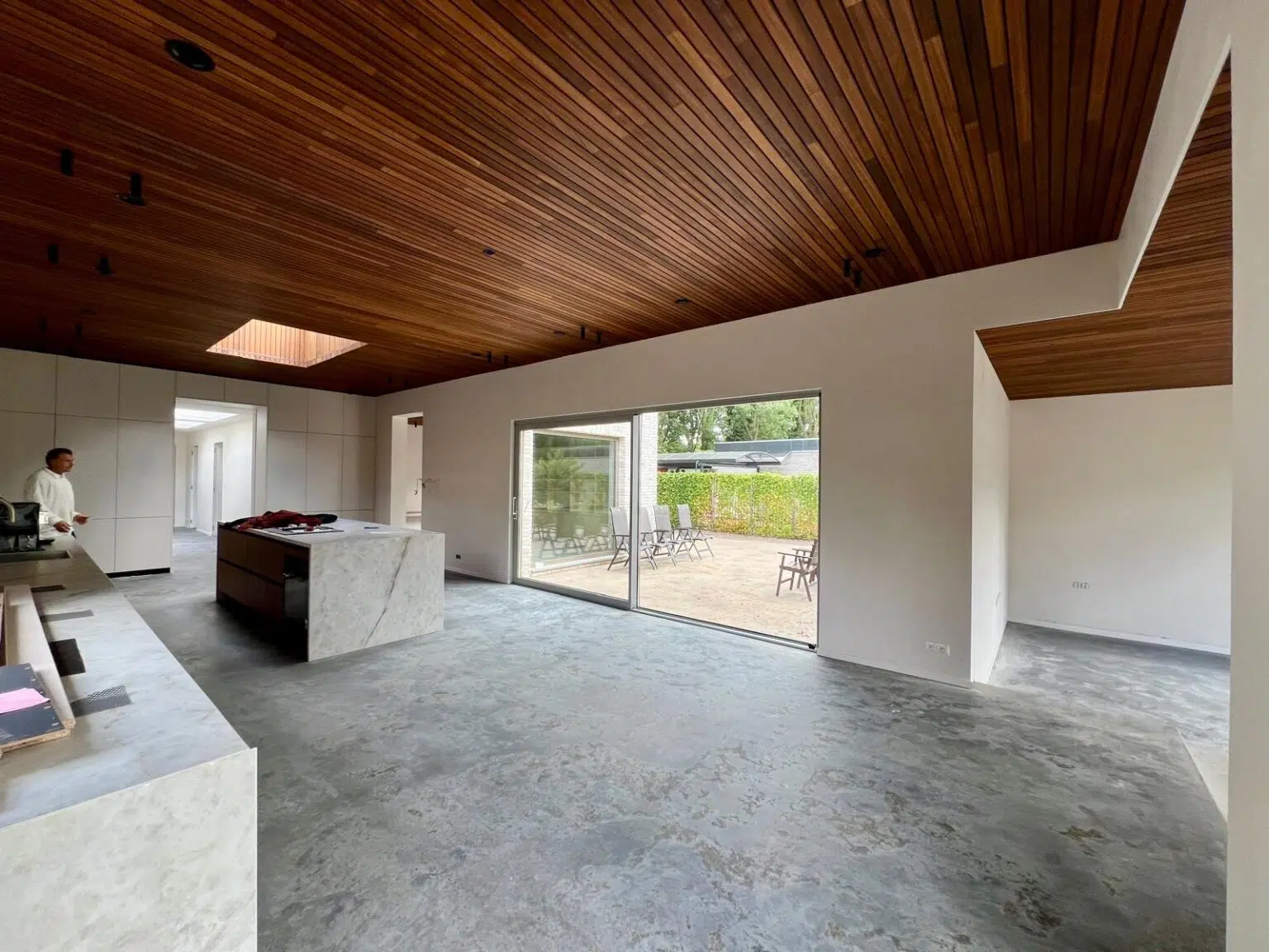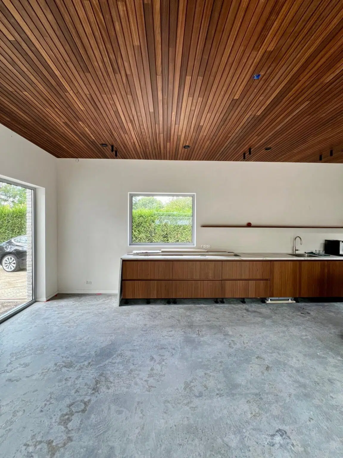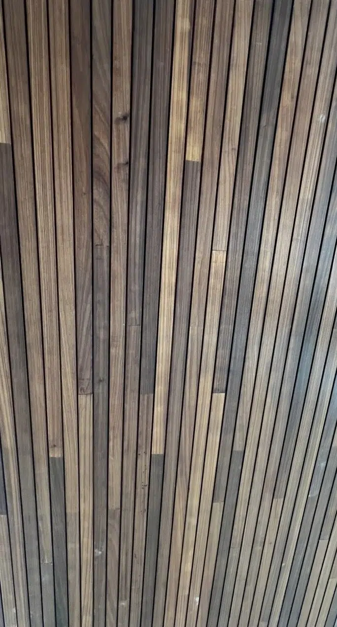 Für diese Decke wurde Thermo-Ayous im Profil Flexlines mit den Abmessungen 20×60 mm in fallenden Längen gewählt. Das Holz wurde mit Woca Diamond Oil Natural behandelt, sodass es seine ursprüngliche Farbe behält.