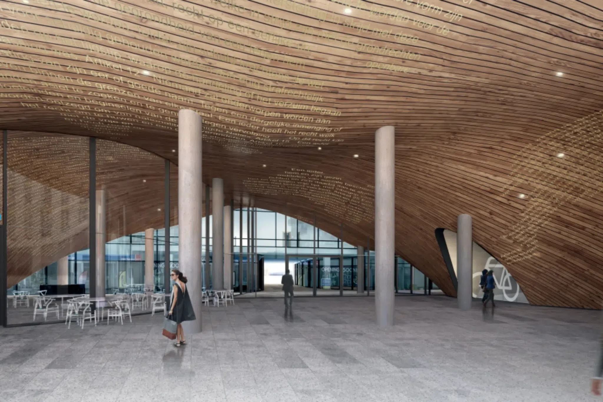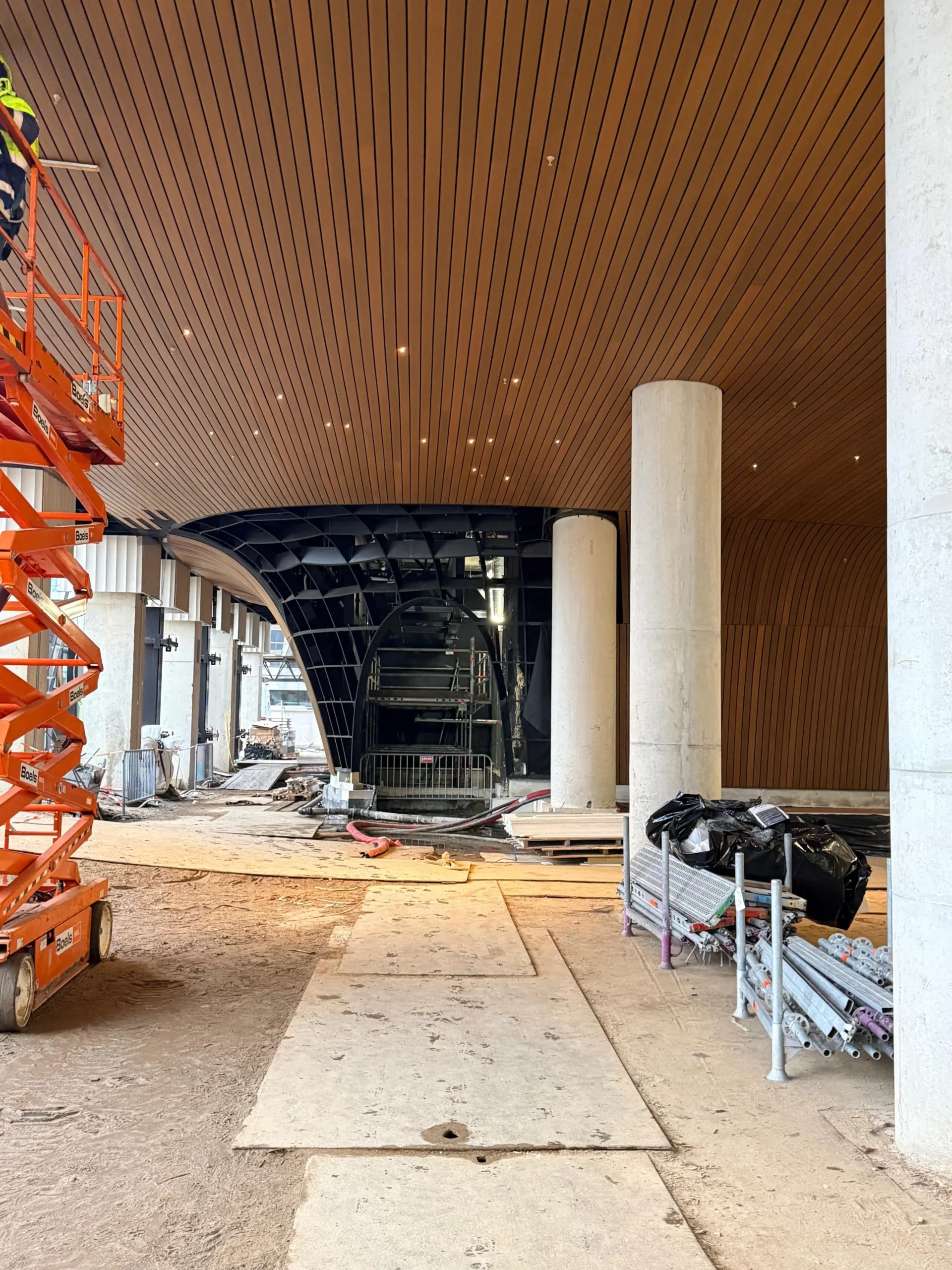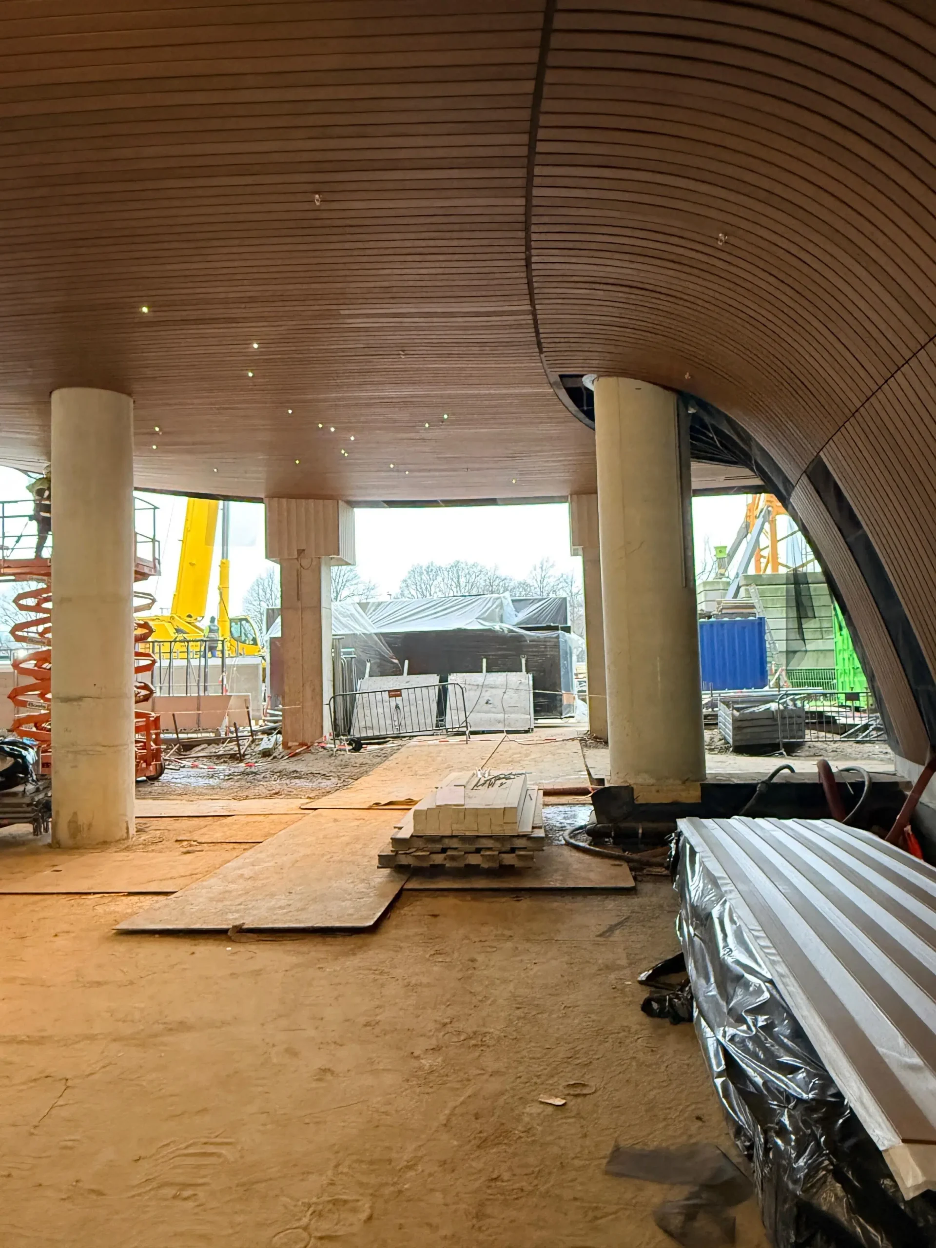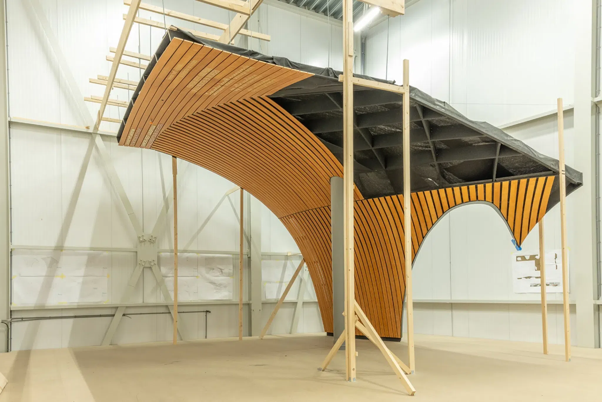 Für die Decke wurde Thermo-Ayous-FSC®-Holz gewählt, das mit einer halbtransparenten Beschichtung behandelt wurde, um seine Farbe zu erhalten, und nach Brandschutzklasse B‑s1,d0 bewertet ist. Durch den Einsatz dünnerer Latten (12×92 mm) ist es möglich, diese so zu biegen, dass sie den geschwungenen Formen der Decke folgen. Insgesamt wurden 30.000 Meter dieser Latten an der Decke verbaut.