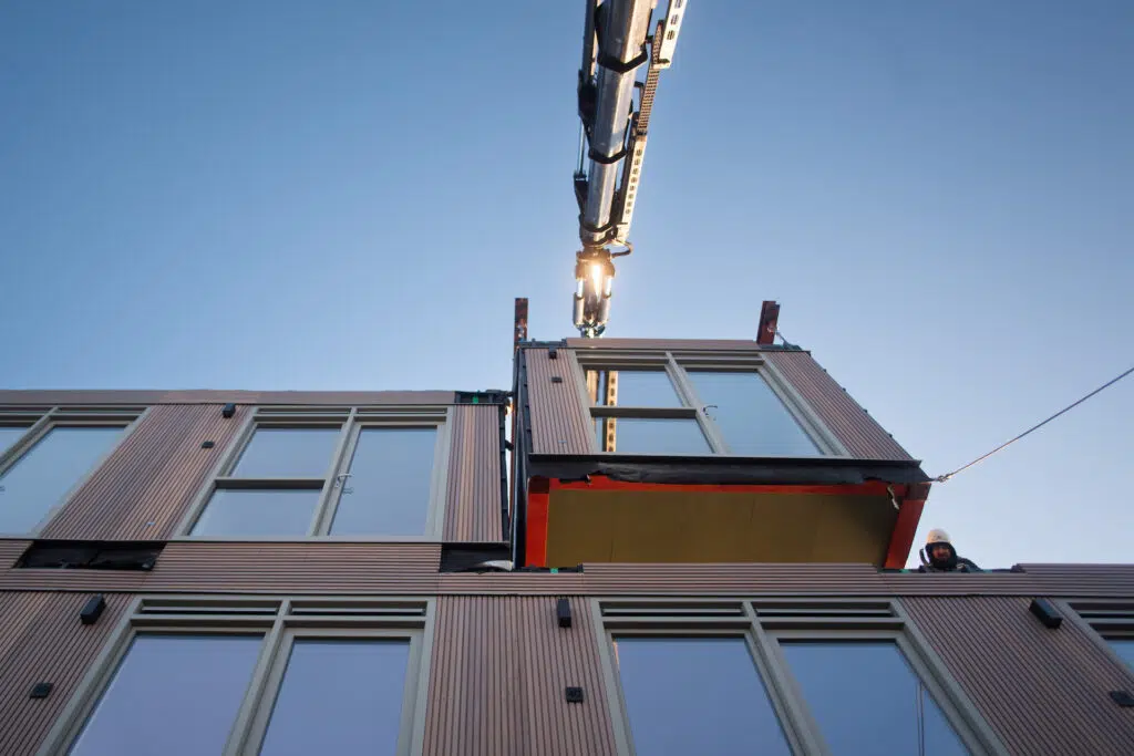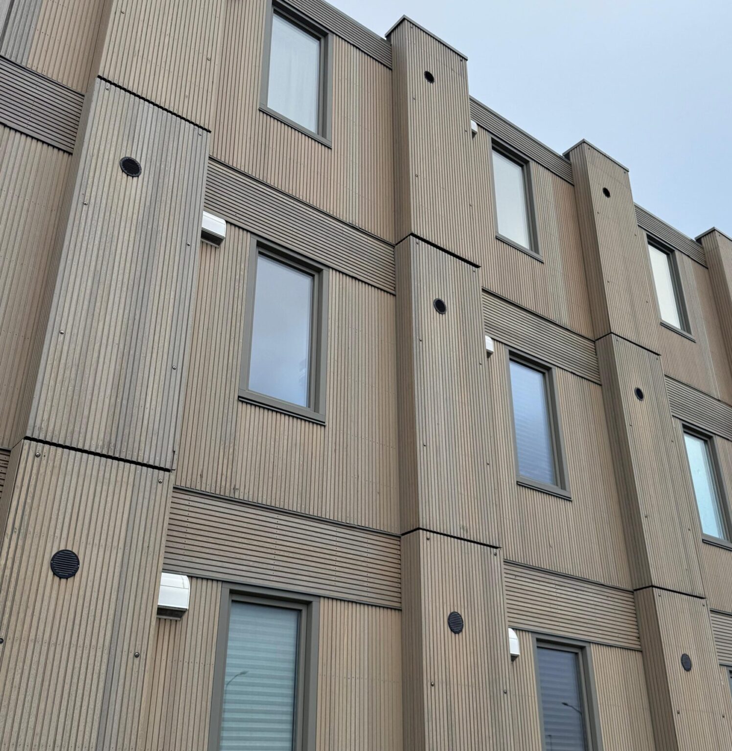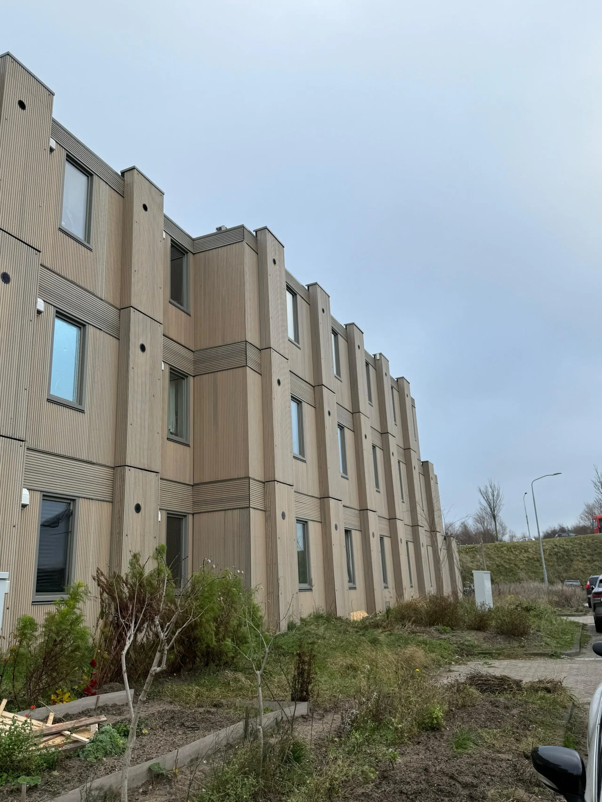 Für die temporären Wohnmodule wählte HDO Groep eine Fassadenverkleidung aus Thermo-Ayous mit dem Triple-Rhombus-Profil (21×130 mm). Die Module bieten eine moderne, nachhaltige Wohnlösung, wobei das Holz durch die vorgegraute Oberfläche eine klare, gleichmäßige Optik erhält.
