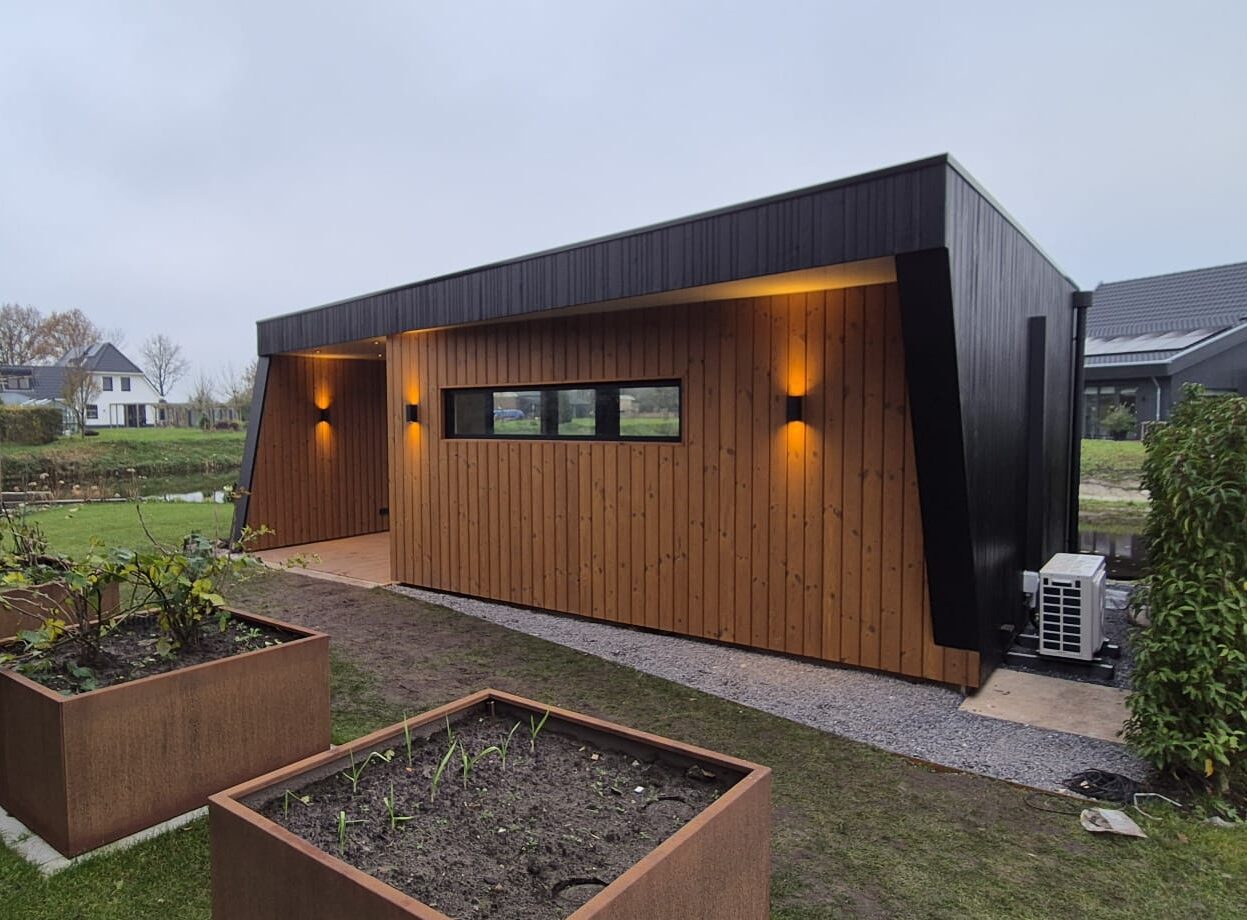 For this luxury garden pavilion, Lunawood was chosen. It was applied in both a natural look and a deep black finish.