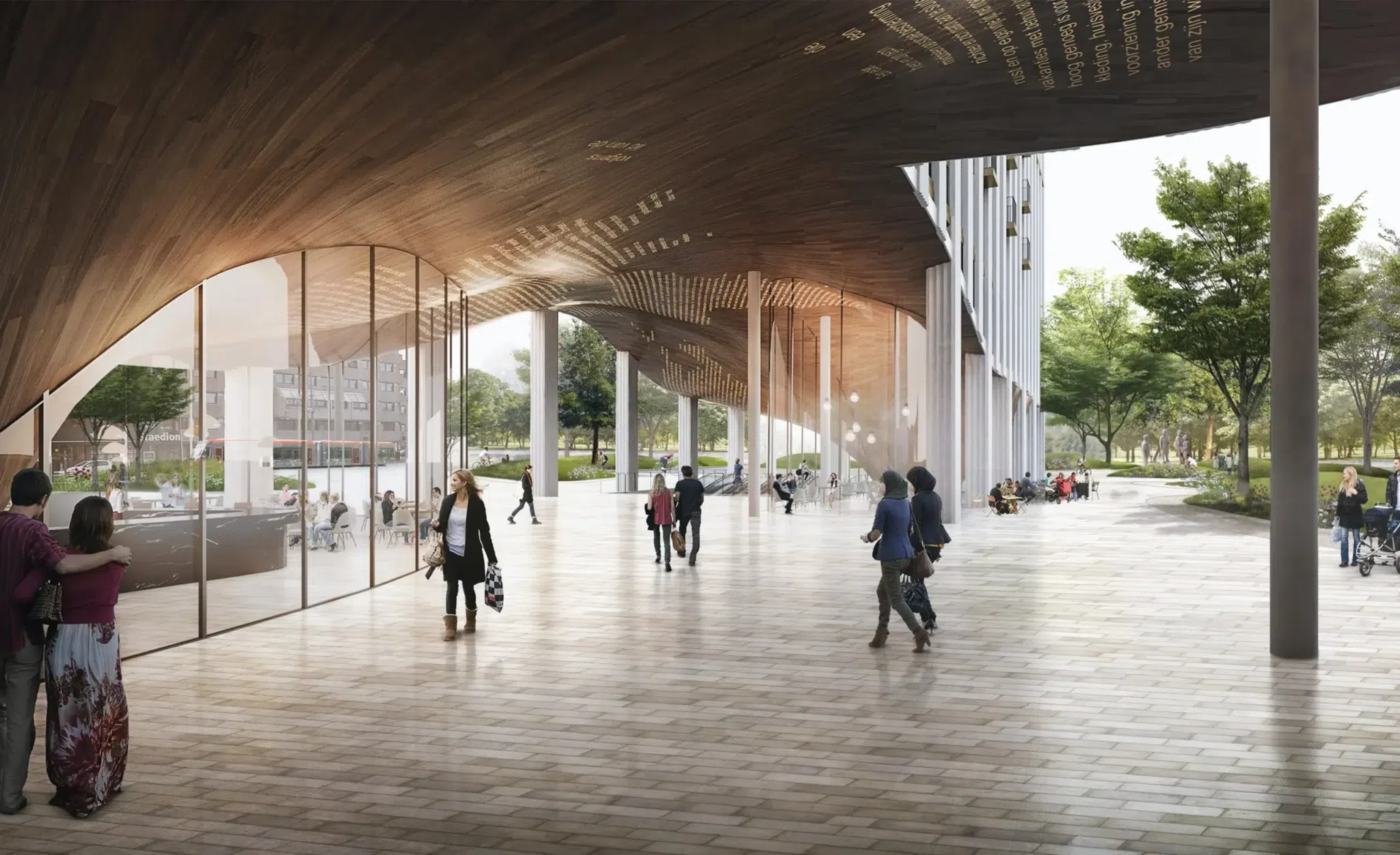 For the ceiling, Thermo Ayous FSC® wood was chosen, treated with a semi-transparent coating to preserve its color and rated Fire class B-s1,d0. By using thinner slats (12×92mm), it is possible to bend them to follow the ceiling’s curved shapes. In total, 30,000 meters of these slats are installed on the ceiling.